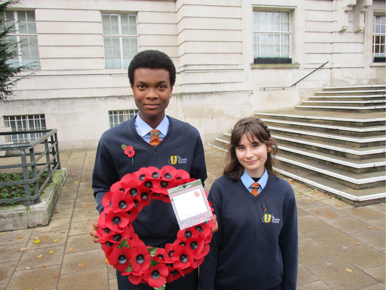 Senior Prefects Ruby and Jaidan accompanied Executive Headteacher Mr Brown, to Hackney’s Service of Remembrance which took place on Sunday 14th November. The parade gathered at Hackney Town Hall and walked to the war memorial at St John at Hackney Churchyard. Poppies were laid and the large crowd observed a two minutes silence at 11am to remember all those who had lost their lives in war and conflict. Jaiden laid a wreath on behalf of members of The Urswick School. In total 62 former old boys of the school lost their lives in the First World War. A teacher, Mr Davis also never came home and is remembered by a memorial bench located in the Urswick Courtyard.